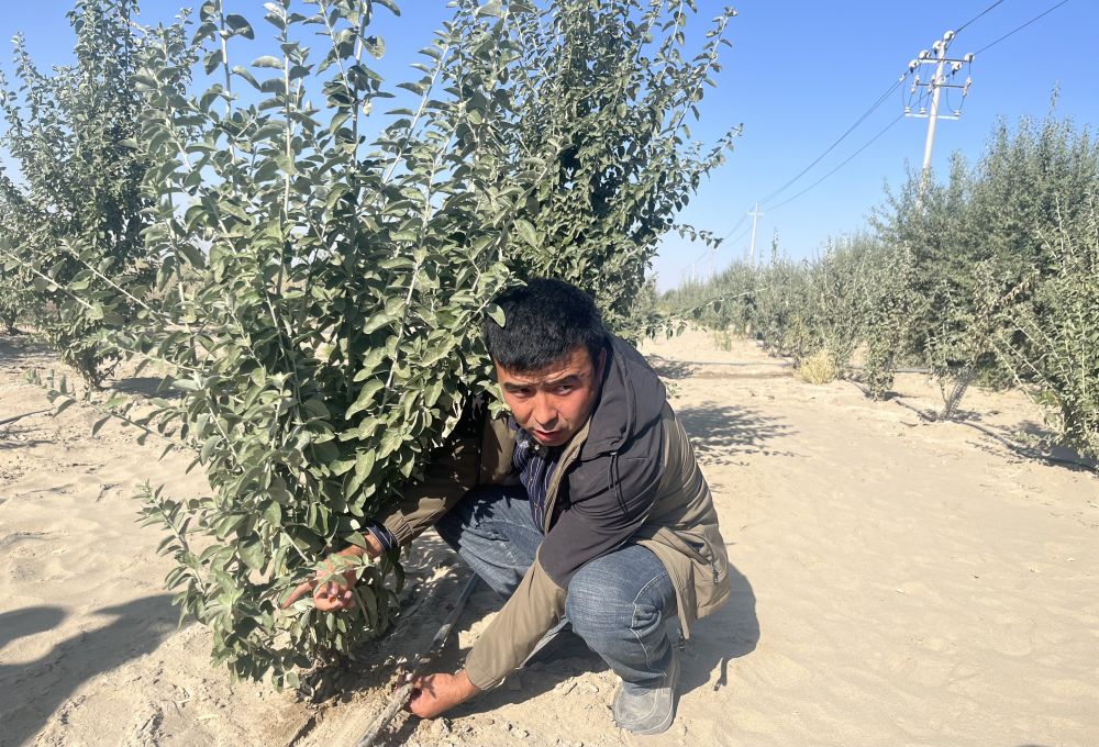阿卜杜萨拉木·塔力普在检查梭梭林的滴灌。新华社记者 杨林 摄
